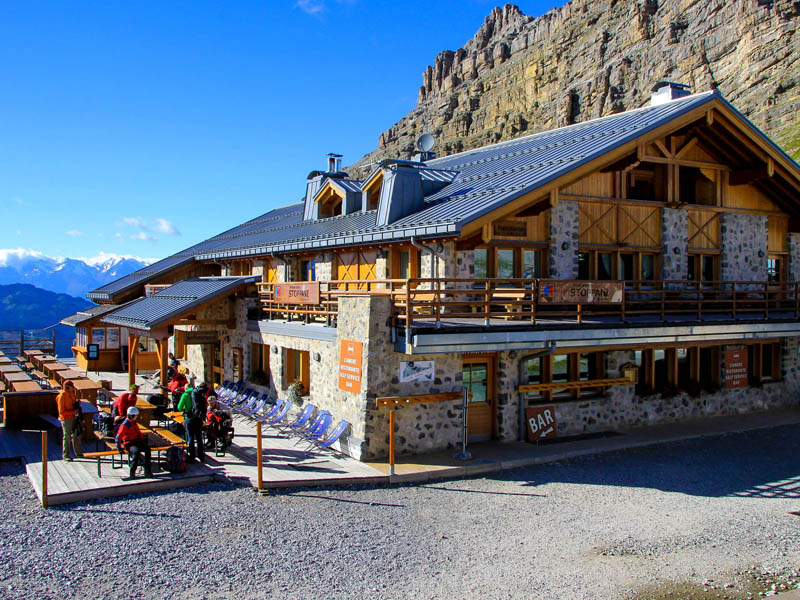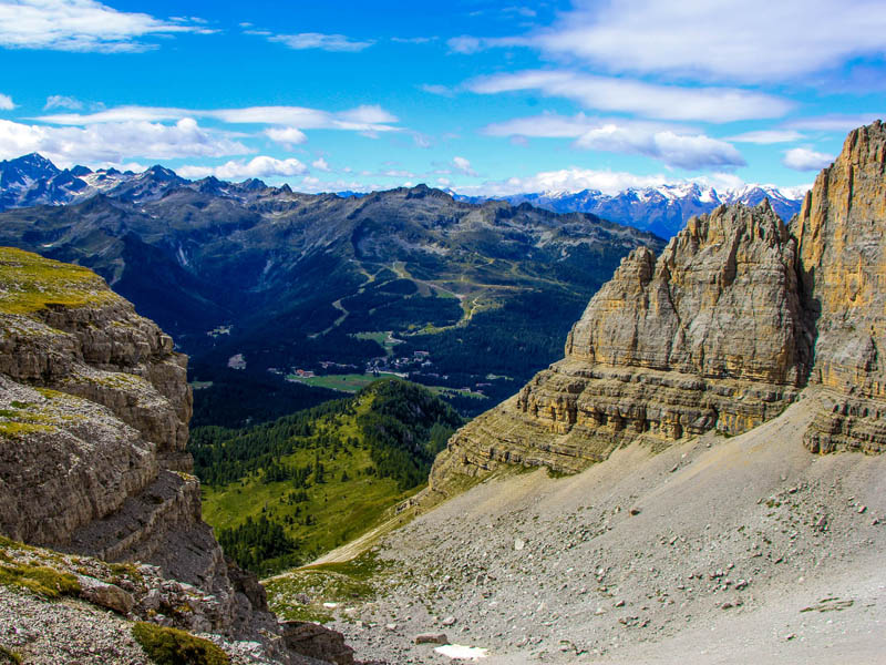 Von der Gratschneide sind auch hier die Tiefblicke ins Tal atemberaubend. Nach dem Ausstieg aus der Ferrata führen windungsreiche Felsensteige bergab zur Seilbahnstation am Passo del Groste und zur Groste-Hütte, einem Berggasthof mit wenig einladender Apres-Ski-Beschallung. So halten wir uns hier auch nicht lange auf. Nach einem Weizenbier wandert die Gruppe ein kurzes Stück talwärts zur gastlichen Graffer-Hütte, um dort nach einem ereignisreichen Klettertag in der Brenta zur Nachtruhe einzukehren