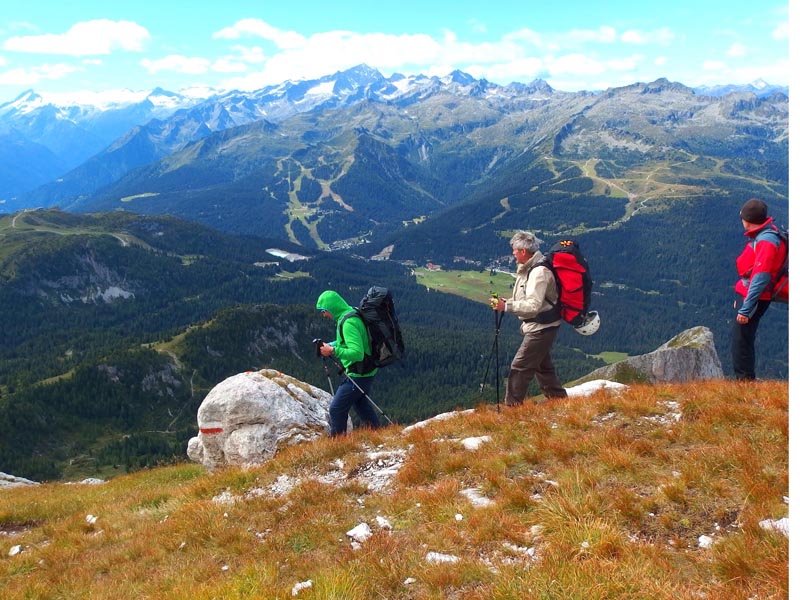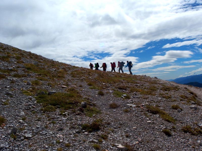 Ausgehend vom exklusiven Wintersportort Madonna di Campiglio durchsteigen die Watzmänner diese hochalpine Region. Am ersten Tag wandert sie siebenköpfige Truppe unter der Leitung ihres Bergführers Christian Treimer anfangs entlang einer Asphaltpiste, wenig später schon auf schmalen, urigen Steigen durch einen urwaldähnlichen Bergwald über die Vaglianella-Alm stramm bergan. Umgestürzte Baumriesen säumen den Weg und holprige Wurzelsteige führen die Gruppe durch ein sattgrünes Meer von Blaubeersträuchern mit reifen Früchten. Jenseits der Baumgrenze geht es unter den steil abfallenden Wänden der Cima Vagliana in den felsigen Steig Sentiero Costanzi hinein. Kleine Kletterstellen, steil abfallende Geröllfelder und ausgesetzte Passagen lassen bereits hier den Charakter dieser wilden Landschaft erahnen.