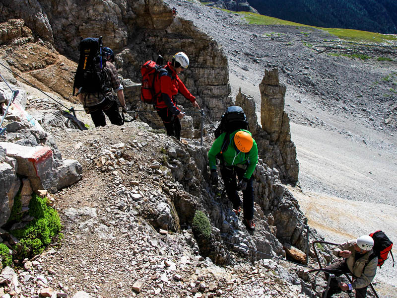 Beim kurz darauf folgenden Einstieg in den Sentiero Gustavo Vidi, einem Klettersteig mit dem Schwierigkeitsgrad A/B, wird der erste Eindruck bestätigt. Mehrere Eisenleitern sind im Auf- und Abstieg zu überwinden. Unterhalb der 2.937 Meter hohen Pietra Grande werden am Drahtseil schmale Felsenbänder durchgeklettert mit traumhaften Blicken ins Tal und spektakulären Fernsichten auf den zentralen Brentastock. Aus der Vogelperspektive ist dabei bereits die Graffer-Hütte zu erkennen, das Tagesziel der ersten Etappe. Ein schmaler Spalt im Fels wird durchstiegen und eine ausgesetzte Gratüberschreitung ist zu meistern. Rechts und links des Klettersteigs bricht dabei das Gelände senkrecht ab, während die Bergsteiger gut gesichert die dramatisch anmutende Engstelle überwinden.