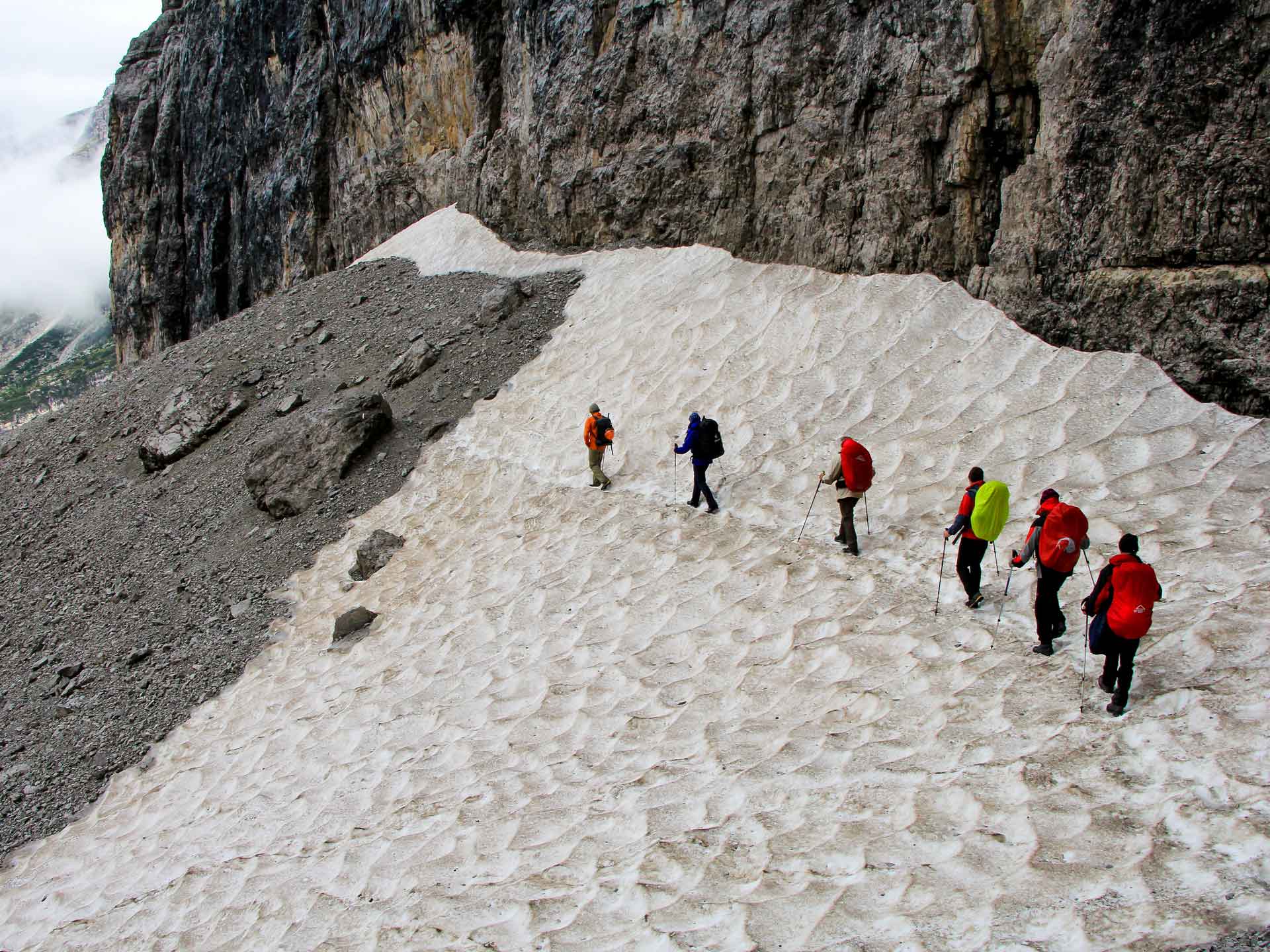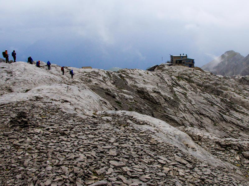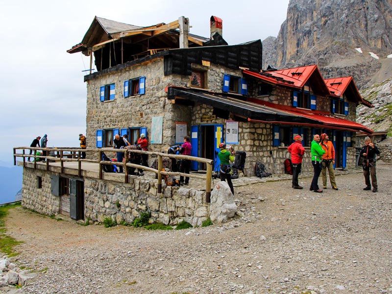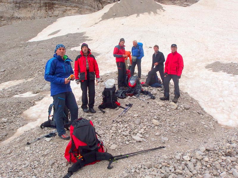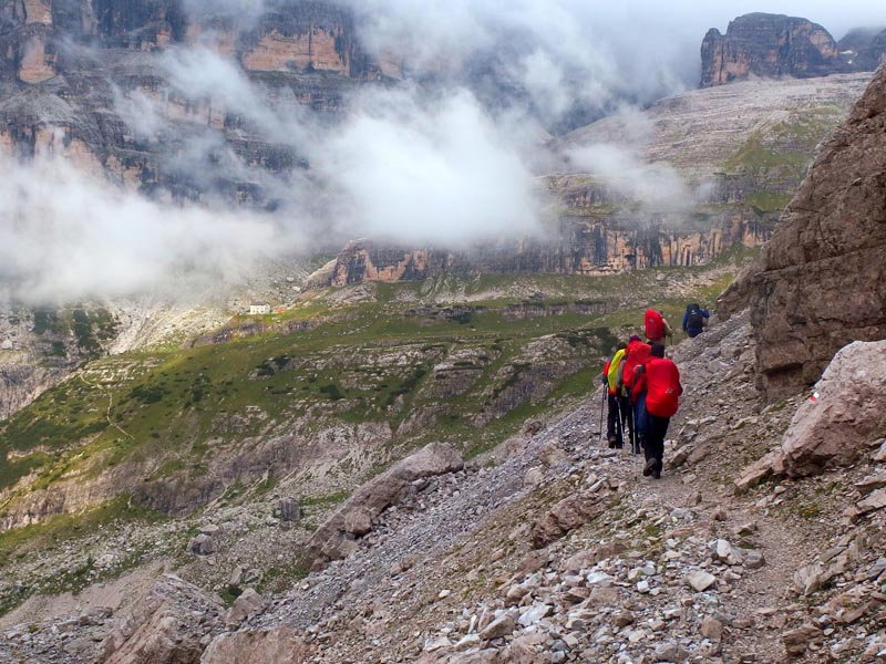 So ist man froh, als man endlich den Ausstieg der Ferrata wohlbehalten erreicht und jenseits der Passhöhe auf windungsreichen Felsensteigen und über Altschneefelder zu Tal wandern kann. Schließlich wird die Apostoli-Hütte mit ihrem mürrischen und wenig gastfreundlichen Hüttenwirt erreicht, um sich mit einem heißen Cappuccino aufzuwärmen. Nach der Mittagsrast geht es auf Bergpfaden noch einmal steil bergan. Auch in diesem Teilabschnitt regnet es ununterbrochen. Die Kapuze tief ins Gesicht gezogen trotzen die Bergwanderer der Nässe und streben Schritt für Schritt der zweiten Passhöhe dieses Bergtages entgegen.