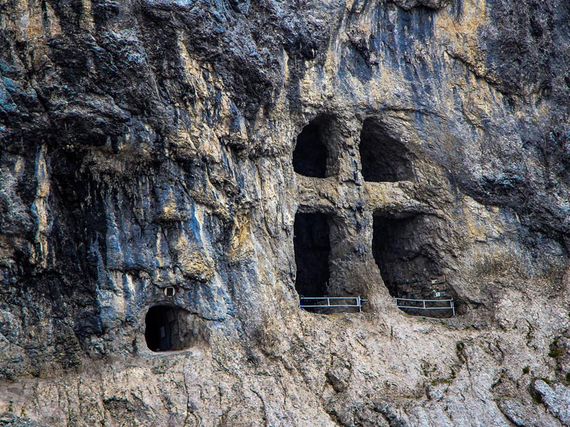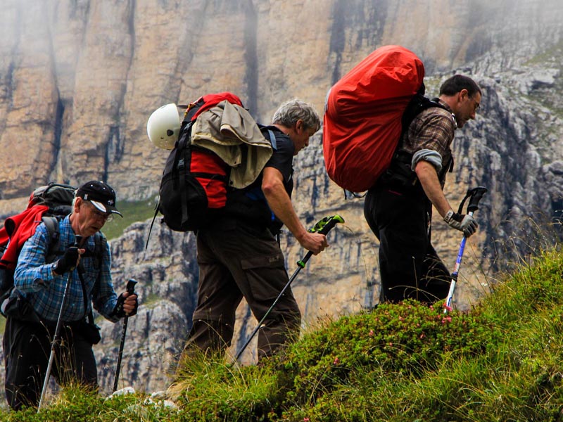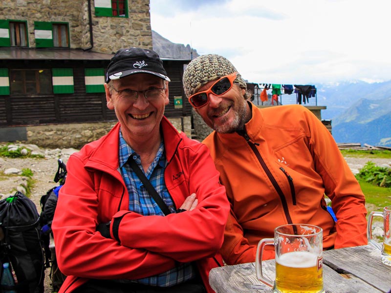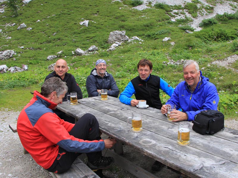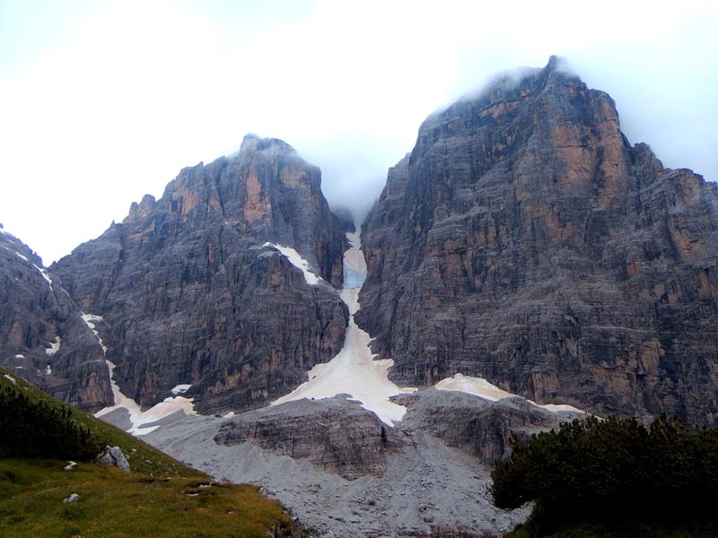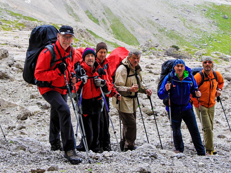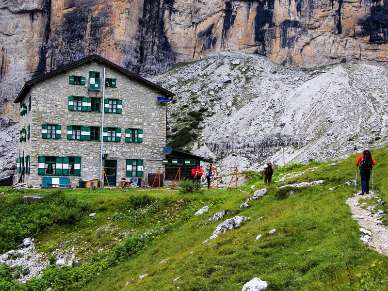 So ist man froh, als man endlich den Ausstieg der Ferrata wohlbehalten erreicht und jenseits der Passhöhe auf windungsreichen Felsensteigen und über Altschneefelder zu Tal wandern kann. Schließlich wird die Apostoli-Hütte mit ihrem mürrischen und wenig gastfreundlichen Hüttenwirt erreicht, um sich mit einem heißen Cappuccino aufzuwärmen. Nach der Mittagsrast geht es auf Bergpfaden noch einmal steil bergan. Auch in diesem Teilabschnitt regnet es ununterbrochen. Die Kapuze tief ins Gesicht gezogen trotzen die Bergwanderer der Nässe und streben Schritt für Schritt der zweiten Passhöhe dieses Bergtages entgegen.