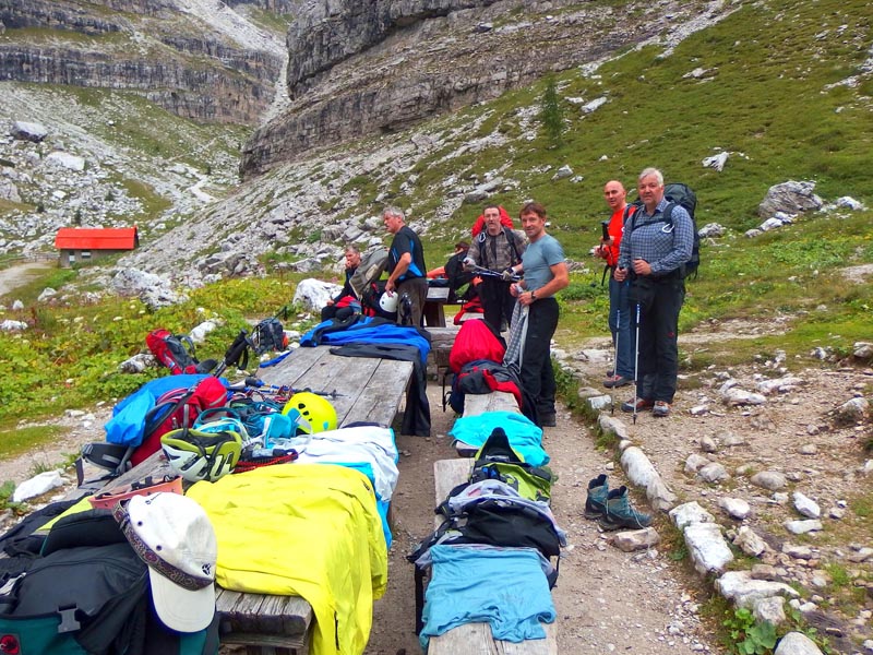 Am vierten Bergtag in der Brenta sieht die Routenplanung einen hochalpinen Übergang von der Agostini-Hütte zur Apostoli-Hütte vor, für den stabiles Hochdruckwetter eigentlich die ideale Voraussetzung gewesen wäre. Ein bedeckter Himmel und kurz darauf einsetzender Nieselregen machen jedoch schnell die Hoffnung der Watzmänner zunichte, den Castiglione-Klettersteig trockenen Fußes zu durchsteigen. So ist die Stimmung etwas gedrückt, als die Gruppe die 2.410 Meter hoch gelegene Agostini-Hütte, mit ihrer beeindruckenden Bergkapelle, verlässt und auf einen Serpentinenpfad in die Flanke der Cima Susat hineinsteigt.