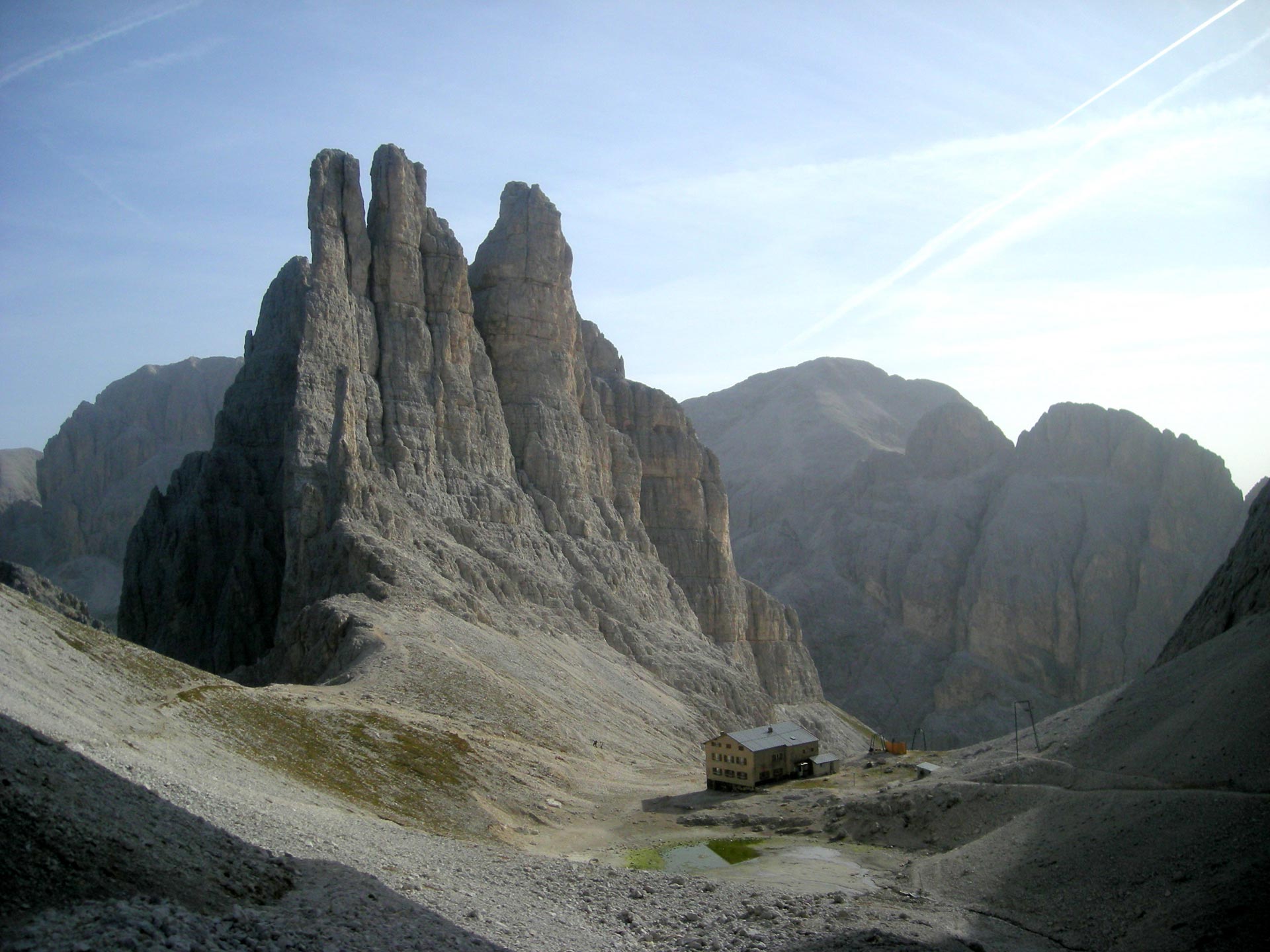 Die dritte Etappe im Naturwunder Rosengarten beginnt sehr moderat. Ein sich windender Bergpfad führt die Watzmänner aus dem Vajolettal hinauf zur Gartlhütte. Anfangs über Geröll, später im steilen Fels kommt die Truppe gut voran. Nur wenige, mit Drahtseilen gesicherte Stellen sind im Aufstieg zu überwinden, bevor die Gartlhütte unterhalb der Vajolettürme erreicht wird. Als wir dann über eine Geröllflanke zum Santnerpass aufsteigen, bietet sich den Kletterern eines der dramatischsten Bergpanoramen in den Dolomiten. Im Herzen des Rosengartens ragen die bizarren Vajolettürme wie drei riesige Schneidezähne steil in den Himmel. Kurz darauf erreicht die Gruppe den 2.741 Meter hohen Santnerpass. Auf Geheiß der Bergführer wird die Klettersteigausrüstung angelegt, denn hier beginnt der Santnerpass-Klettersteig.