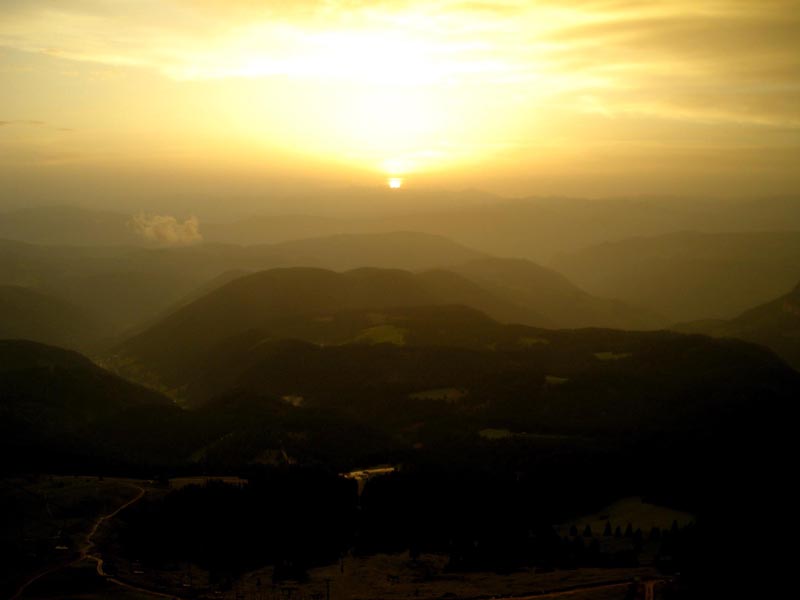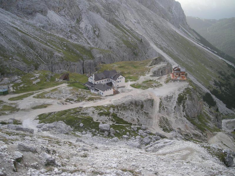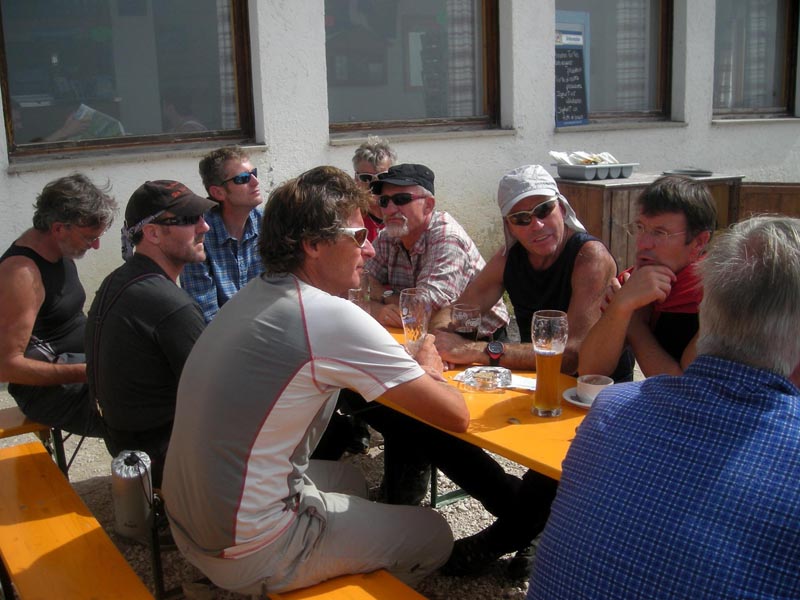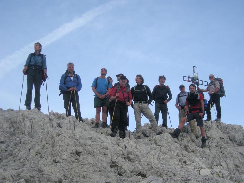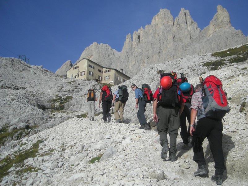 Ganz zum Schluss erreichen die Watzmänner dann noch einen herrlichen Aussichtspunkt. Der Blick fällt hinunter zur Rosengartenhütte und weit voraus auf das Gebirgsmassiv des Latemar, das jenseits des Karer Passes aufragt. Für besondere Dramatik sorgen die lotrechten Felsabrüche des Rosengartens. Entlang der sich nach Südwesten absenkenden Hangkante folgen wir nun dem kleinen Gebirgspfad. Dabei genießt die Gruppe die traumhaften Tiefblicke ins Tal. Schließlich wenden wir uns nach rechts und steigt über Serpentinen zur Rosengartenhütte ab. Auch im letzten Abschnitt ragen bizarre Felsengebilde auf, zwischen denen die Watzmänner abwärts kletternd noch einmal ans Drahtseil müssen. Die gastliche Berghütte ist gut besucht, liegt sie doch wie ein Balkon hoch über dem Tal. Mit dem Laurinlift kommen viele Rucksacktouristen hinauf, um die herrliche Aussicht zu genießen. Zum Schluss dieses herrlichen Bergwandertages fegt ein kurzes Gewitter durch den Rosengarten. Ihm folgt ein traumhafter Sonnenuntergang in den Bergen.