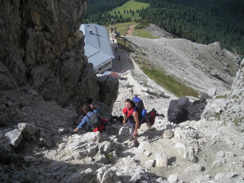 Es macht keine großen Probleme diese Steiganlage zu durchklettern, denn es handelt sich um eine mittelschwere Ferrata. Lediglich ein 10 Meter hoher Steilabschwung im bröseligen Fels, der rückwärts zu durchklettern ist, erweist sich als etwas heikel. Besondere Dramatik vermitteln allerdings die steil aufragenden Wände, Türme und Zinnen, die in den ungewöhnlichsten Formen in den Himmel ragen. Alles ist wilder und zerklüfteter als an den vorangegangenen Tagen. Nur die Natur schafft es, solche Ungetüme über Jahrmillionen herauszubilden. Der Mensch kommt sich in diesem gewaltigen Szenario klein und verloren vor. Im Santnerpass-Klettersteig sind wir heute nicht alleine unterwegs. Die Route wird in der Gegenrichtung stark begangen. So kommt es an den wenigen schwierigen Stellen des Öfteren zu kleinen Staus. Ein kurzes Leiterstück ist auch hier zu überwinden und ausgangs des Steiges wird durch eine schmale Rinne abgeklettert.