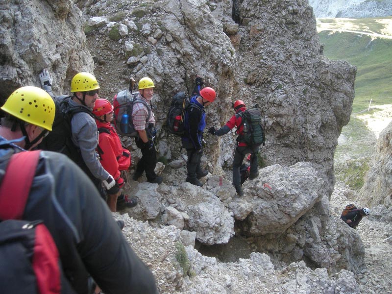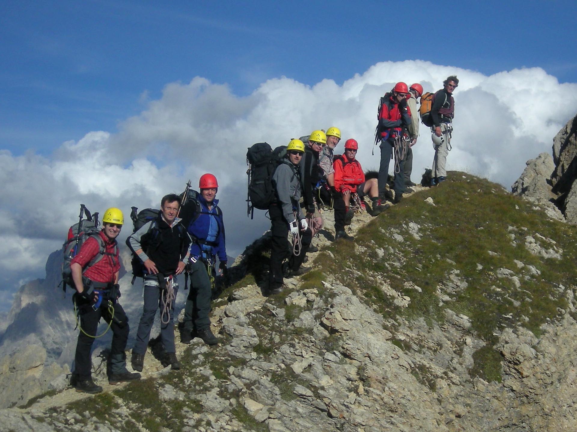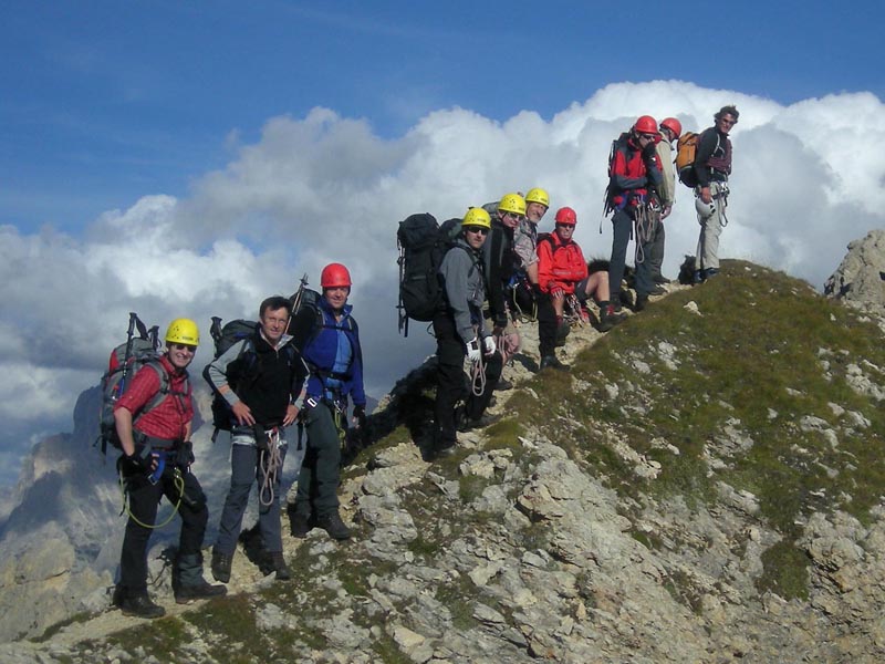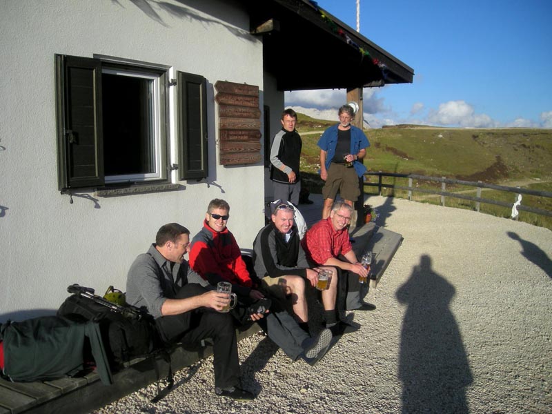 Der Große Rosszahn ist mit Abstand die wuchtigste Erhebung, einer Gruppe mit unzähligen Türmen und Zinnen, die sich nach Nordosten hin anschließt und die man gemeinhin als die „Rosszähne“ bezeichnet. Über den Grat steigt die Gruppe in die Rosszahnscharte ab und von dort am fest verankerten Drahtseil durch den Steilabstieg hinunter zur Tierser Alpl Hütte. Hier klingt dieser zauberhafte Bergtag aus, das erste Bier macht die Runde und nach kurzer Zeit ist auch im Rosengarten der bekannte Trinkspruch der Watzmänner lautstark zu hören, das dreifach kräftige Watz..mann, Watz..mann, Watz..mann!!!