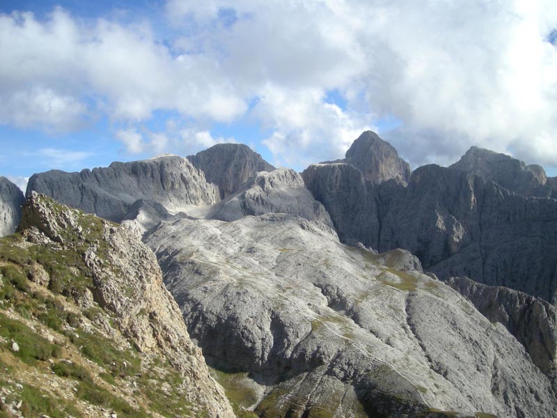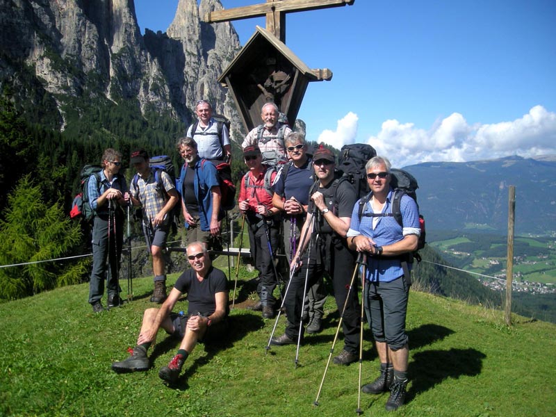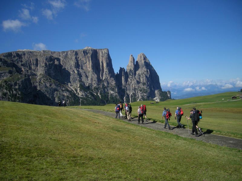 Die zehnköpfige Gruppe startet zur Rosengartendurchquerung auf der Seiseralm. Gleich zu Beginn zeigt sich das Bergpanorama wahrhaft gigantisch. Wie ein gewaltiges Bollwerk ragt vor den Watzmännern der Schlern mit seinen senkrechten Wänden auf. Über den Touristensteig erreichen wir die Schlernhochfläche. Steinmanderl weisen den Weg hinauf zum Gipfel der Roterdspitze. Obgleich kein Gipfelkreuz die 2.658 Meter hohe Bergspitze schmückt, ist das Panorama wahrhaft grandios. Weit schweift der Blick über das riesige Areal der Seiseralm. In der Ferne sind die Langkofel- und Sellagruppe zu bewundern und in der Nähe ragen die Erhebungen des Rosengartens auf.