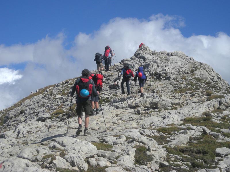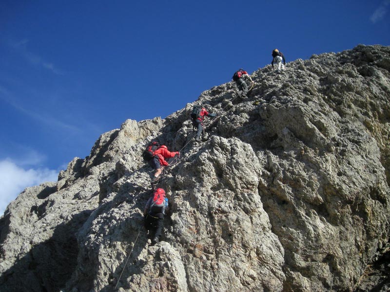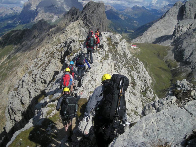 Nach der Gipfelrast wird die Klettersteigausrüstung angelegt, denn hier beginnt der Maximiliansteig. Vom der Bergspitze klettern die Watzmänner in die Roterdscharte ab. Rechts und links des Grates, oder genau darüber hinweg verläuft die Route. Der Steig hat es in sich! Sicherungsseile sind recht selten anzutreffen und das Gelände ist ziemlich ausgesetzt. Oftmals ist freies Klettern im 1. Grad erforderlich um die exponierten Stellen zu meistern. An der Schlüsselstelle, einem kleinen Kamin, zieht man sich mittels einer Handschlaufe in eine Felsspalte hinein und sucht sich rechts und links im lotrechten Fels feste Tritte. Hier ist gar Klettertechnik im 2. Grad gefragt. Die Fortsetzung der Route bis zum Gipfel des Großen Rosszahns gerät zu einer einzigartigen Gratwanderung. Von der 2.653 Meter hohen Bergspitze fällt der Blick dann besonders schön auf die Tierser Alpl Hütte, in der wir unser Nachtlager beziehen werden.