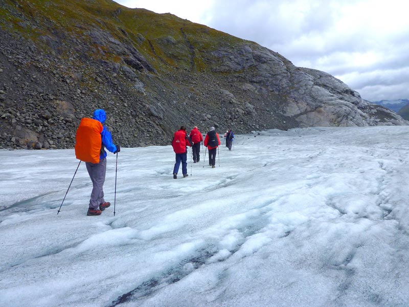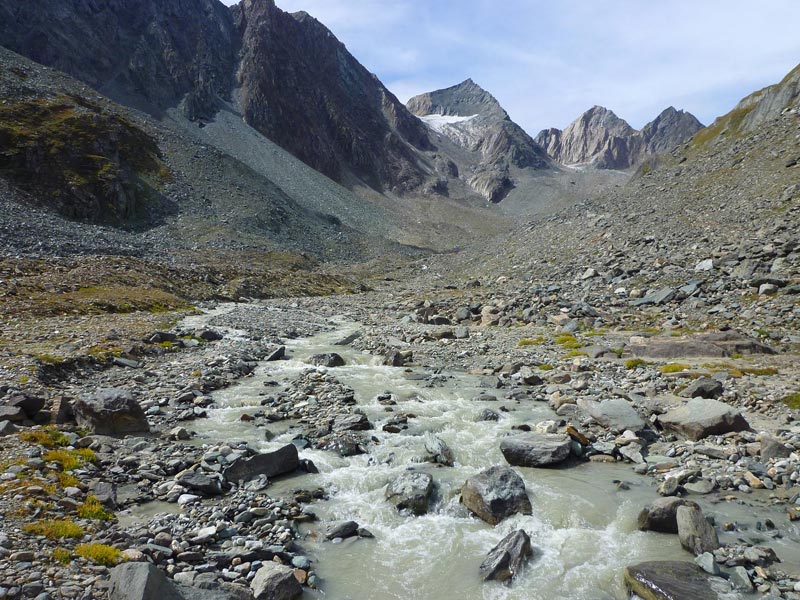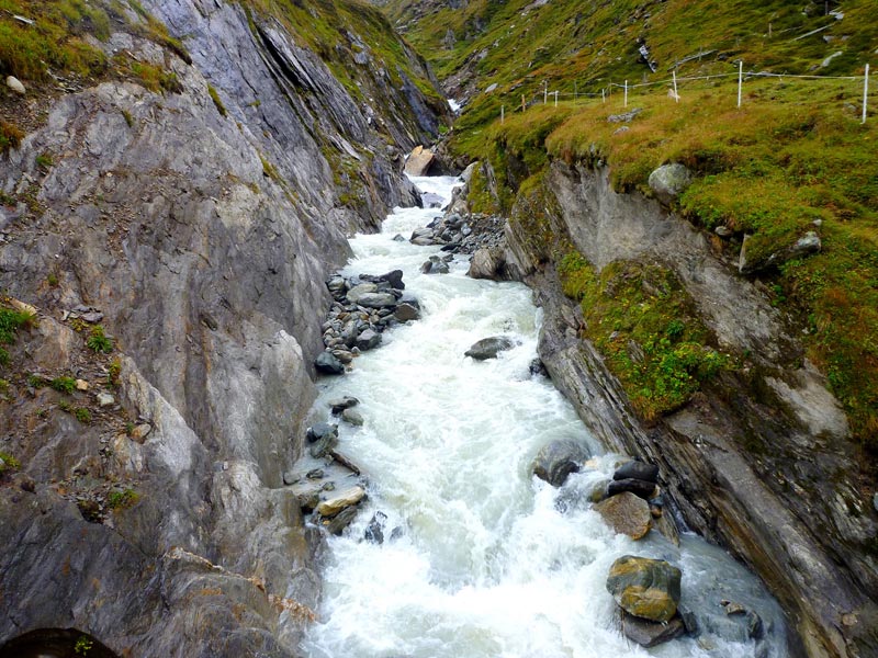 Absolutes Highlight ist natürlich die Besteigung des Grossvenedigers über ausgedehnte Gletscher am letzten Bergtag. Bei leichtem Nieselregen wandern wir von Ströden in das Maurertal hinein. Entlang des Gebirgsbaches geht es anfangs auf einem breiten Fahrweg zur Stoanalm hinauf. Dann führen steile Serpentinenpfade neben dem tief eingeschluchteten Maurerbach in den Steilhang hinein. Das Rauschen eines Wasserfalls wird immer stärker, als wir uns der Essen-Rostocker-Hütte nähern. In unzähligen kleinen Kaskaden stürzt hier das Gletscherwasser tosend zu Tal.