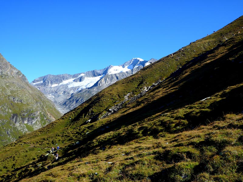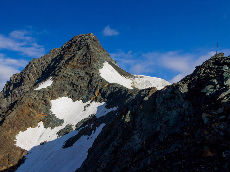 Hinter der Johannishütte auf 2.121 m steigt der Venediger Höhenweg auf felsigen Pfaden sogleich steil an. Von der Anhöhe fällt der Blick hinüber zum Türmljoch, dem Übergang des gestrigen Bergtages und wenig später auch hinauf zum Großvenediger, der mit seiner langgezogenen Firnflanke eine unverkennbare Gipfelsilhouette bildet. Mit zunehmender Höhe wird das Gelände felsiger. Schutt und Geröll sind unsere ständigen Wegbegleiter, als die Route steil aber unschwer zur Zopedscharte hinauf führt. Ein Steinhaufen aus dem der Wegweiser herausragt zeigt an, dass wir den Übergang auf 2.958 m erreicht haben. Hier wird eine Pause eingelegt, bevor es zur anderen Seite steil bergab geht.