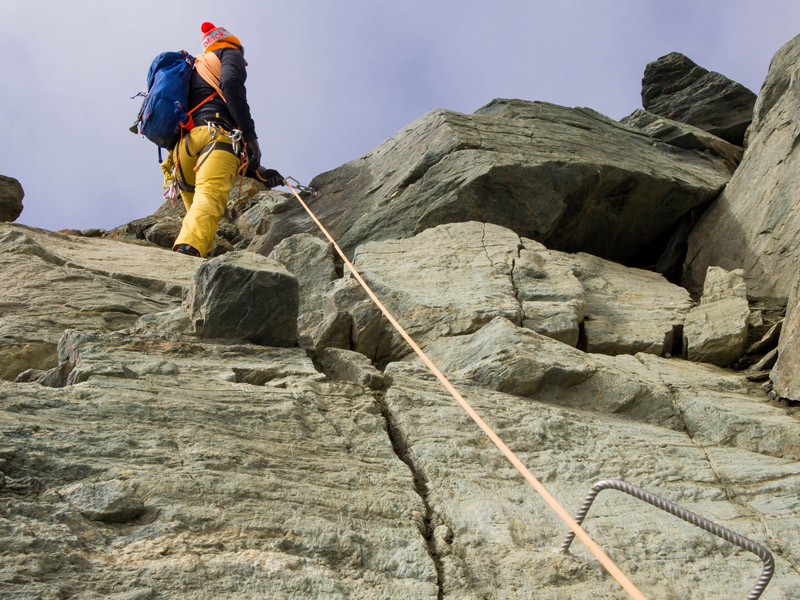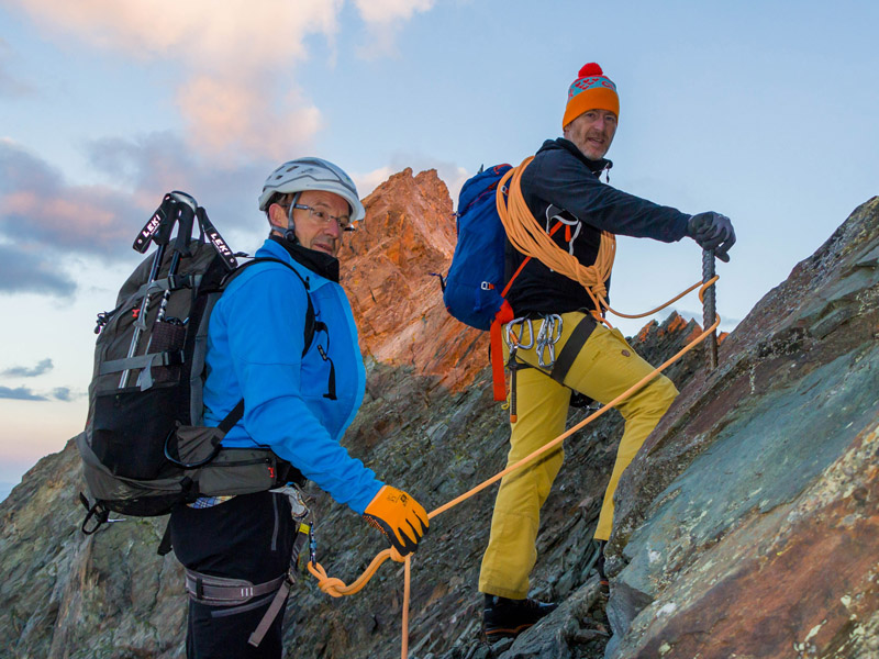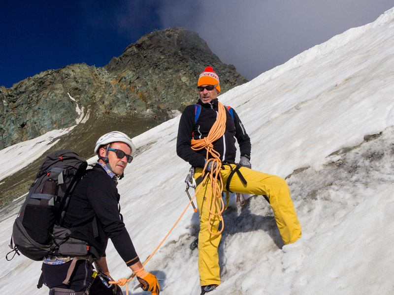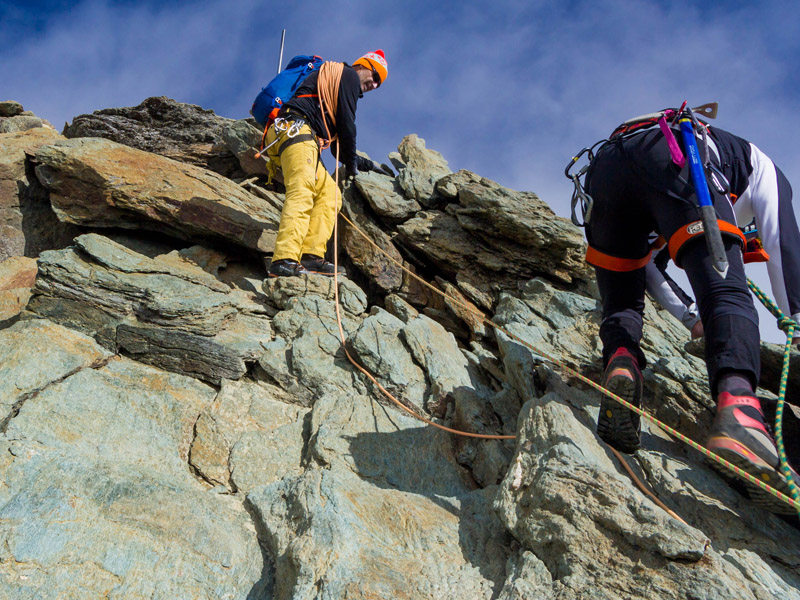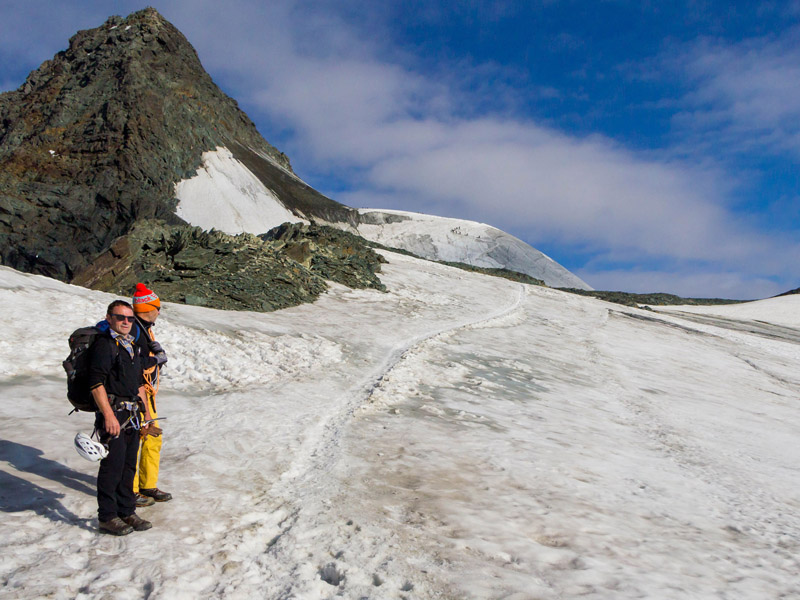 Von der Adlersruhe ging es über einen anfangs flachen Firnrücken, dann steiler ansteigend, zum sogenannten Glocknerleitl. Dies war bereits eine heikle Stelle, da es sich teilweise um bis zu 40° steiles Gelände handelte, das sich im Spätsommer oftmals als Blankeis mit Felsauflage zeigt. Bei guter Schneeauflage ist dagegen eine entspannte Spur eingetreten und man steigt durch das steile Leitl in Serpentinen zum Grat hinauf. Das Ende des Leitls ist je nach Schneeauflage mit Firn gefüllt (angenehm zu gehen) oder in brüchigem Fels zu bewältigen (unangenehm, mit Steinschlaggefahr!), so wie es bei uns der Fall war. Am Grat angelangt, führte der Weg nun sehr steil in Richtung Kleinglockner (Schnee oder Fels, I-er Gelände). Hier sorgten einbetonierte Metallstangen und einzelne Haken für entsprechende Absicherungsmöglichkeiten. Wir befanden uns nun in sehr ausgesetztem Gelände mit ordentlichem Tiefblick in Richtung Ködnitzkees. Auch hier schwankt der Anspruch abhängig von den aktuellen Verhältnissen sehr stark. Zwingend erforderlich ist absolute Schwindelfreiheit und Trittsicherheit in Schnee und Fels.
