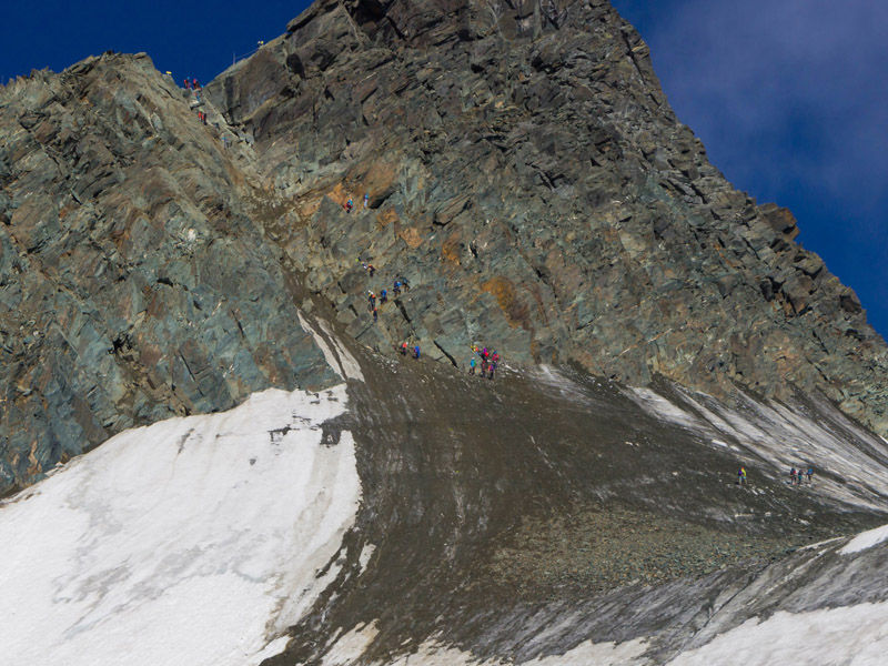 Ab dem Gipfel des Kleinglockners (3.770 m) kam nun eine weitere schwierige Stelle. Über eine versicherte Kette stiegen wir ab in die Glocknerscharte. Ein sehr schmaler Grat, wo es links und rechts (Palavicinirinne) 700 m senkrecht abwärts geht. Als wir den ausgesetzten, mit einem Fixseil gesicherten Grat überwunden hatten, stellte sich uns die Schlusswand des Großglockners entgegen. Hier besteht häufig Staugefahr, da die Glocknerscharte so schmal ist, dass sie nur einzeln begangen werden kann. Nach der rund 20 Meter hohen Felswand, die wir im gut griffigem II-er Gelände durchkletterten, wartete nur noch ein flacher Rücken auf die Bergsteiger. Dann standen wir nach insgesamt 5 ½ Stunden und 1154 Höhenmetern, um 10 Uhr auf dem Gipfel des höchsten Berges Österreichs, dem 3.798 Meter hohen Großglockner. Der Rückweg erfolgte auf der gleichen Route wieder zurück zur Salmhütte.