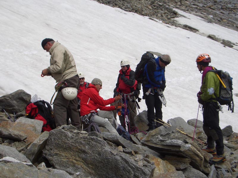 Am vierten Tag in den Stubaier Alpen wird von der Dresdner Hütte die Besteigung des Zuckerhütls in Angriff genommen. In aller Frühe machen sich die Watzmänner auf den Weg, denn am späten Nachmittag soll das Wetter umschlagen. Über eines dieser unseligen Geröllfelder geht es zum Fernau-Ferner hinauf. Hier werden Steigeisen angelegt, die beim Überqueren des Gletschers eine unentbehrliche Hilfe sind und eine erhebliche Erleichterung beim Bergsteigen über Eis und Schnee mit sich bringen. Am Fernaujoch quert die Gruppe nach links, legt die Steigeisen wieder ab und klettert über den Grat zum Pfaffenjoch hinüber. Mit zwei Seilschaften, jede angeführt von einem Bergführer, geht es sodann über das ewige Eis des Sulzenauferners.