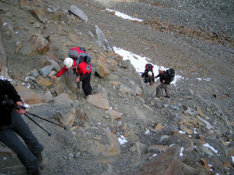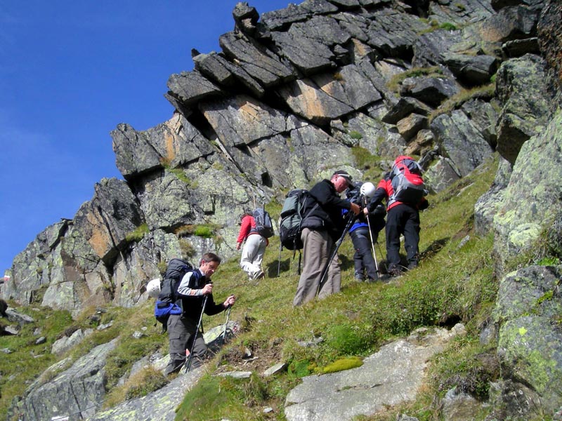 Mit dem Sonnenaufgang wandern wir am dritten Bergtag von der Neuen Regensburger Hütte auf einem sanft ansteigenden Bergwiesenpfad und stets entlang eines Gebirgsbaches weiter in das Hochtal hinein. Nach einer Stunde Gehzeit gelangt die Gruppe an den Fuß des Grawagrubennieders. Auch hier handelt es sich wie tags zuvor beim Schrimmennieder um ein Joch, welches auf dem Weg zur Dresdner Hütte überschritten werden muss. Erneut schlagen wir uns im steilen Anstieg mit Geröllhalden, riesigen Felsbrocken und rutschigen Steinplatten herum und kommen nur mühsam voran. Mittels Drahtseilen hat man den Aufstieg zum Joch ein wenig entschärft, allerdings kann man am Grawagrubennieder kaum noch von einem Bergwanderweg reden, da hier absolute Trittsicherheit erforderlich ist. Auf dem Scheitelpunkt der Scharte ist die Aussicht dann aber atemberaubend. Erneut können wir die ganze Gletscherwelt des Hochstubai in Augenschein nehmen.
