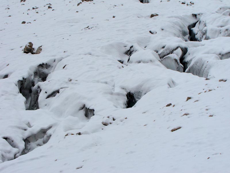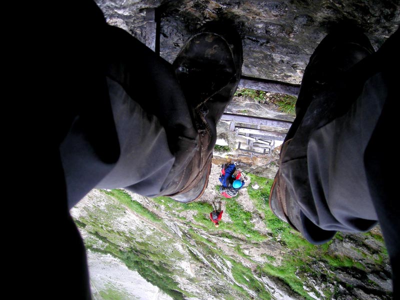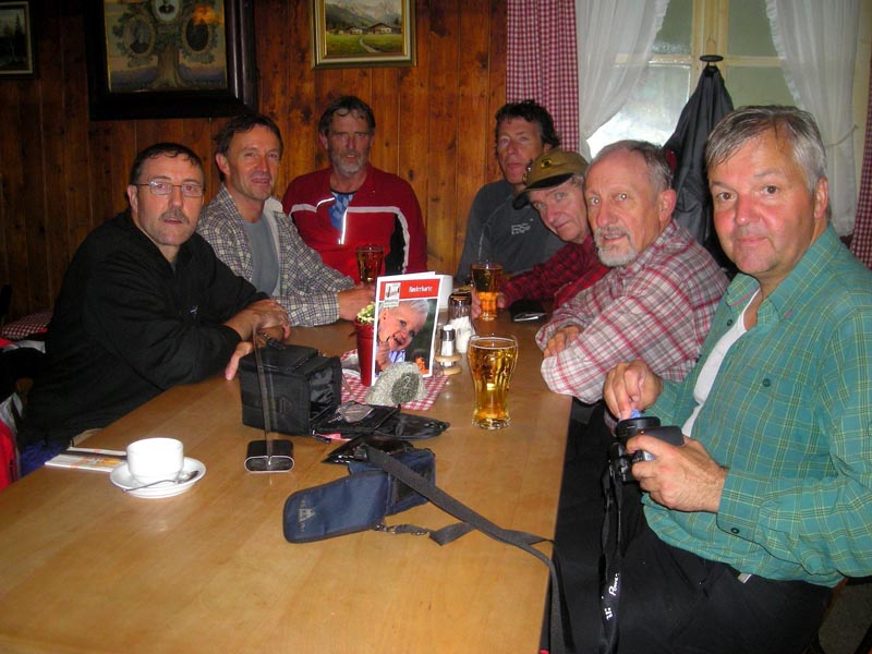 Wir bewegen uns jetzt oberhalb der Baumgrenze und haben die 2.000-Meter Marke überschritten, als wir uns zu einer ausgiebigen Rast entschließen. Trotzdem die Wetterfrösche für den Nachmittag eine Auflockerung vorausgesagt haben, will das Wetter einfach nicht besser werden. An einem kleinen Rinnsal füllen wir unseren Getränkevorrat noch einmal auf und steigen dann in das Moränengelände des Höllentalferners hinein. Plötzlich ist ein fernes, lang anhaltendes Grollen zu hören, das nichts Gutes erwarten lässt. Dieser Vorgang wiederholt sich noch mehrmals. Als wir schließlich die neblige Gletscherzunge des Höllentalferners erreichen, sehen wir die Bescherung. Im Hochsommer sind hier auf 2.300 Höhenmetern mehrere Schneelawinen abgegangen und lassen den weiteren Anstieg zum Gipfel als zu gefahrvoll erscheinen. So entschließen wir uns schweren Herzens das Unternehmen Zugspitzbesteigung am Fuße des Höllentalferners abzubrechen und entlang der Aufstiegsroute wieder bergab zu steigen. Über Brett und Leiter klettern wir zu Tal. Schließlich gelangt die Gruppe wieder zur Höllentalangerhütte. Während der Einkehr kommt endlich die Sonne zum Vorschein und die umliegenden Bergspitzen ragen für den Rest des Tages unter einem strahlend blauen Himmel auf.
