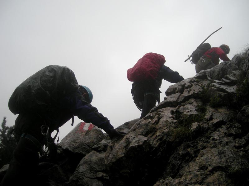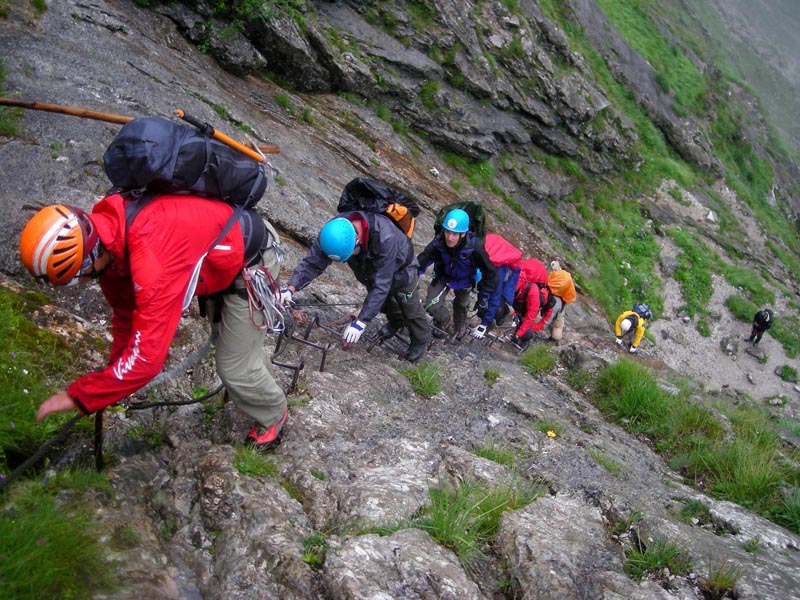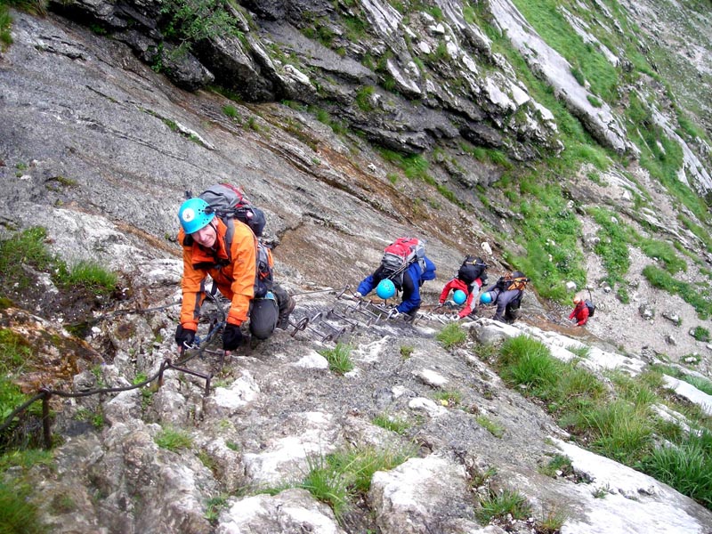 Gut gestärkt verlassen wir die Höllentalangerhütte, überqueren den Oberlauf des Hammersbaches ein weiteres Mal und wandern auf einem idyllischen Bergpfad in den Höllentalanger hinein. Rechts und links des Steiges hat sich in dem kargen Gelände ein kleiner Bergwald aus Fichten und Latschenkiefern ausgebreitet, der uns bis an den Wandfuß begleitet. An der nach rechts abzweigenden Zuwegung zur Riffelscharte lässt Bergführer Christian Treimer die Klettersteigausrüstung anlegen. Etwas weiter oben im glatten Fels sind Stahlseile angebracht, in die man sich mit den Klettergurten einhängen kann. Sie sorgen dann schnell für die notwendige Sicherheit. Als nächstes Highlight auf dem Weg zum Zugspitzgipfel ist die „Leiter“ zu überwinden. Die Erbauer Leiter haben auf einer Länge von ca. 40 Metern Stahlklammern in die senkrechte Wand getrieben, über die man wie auf einer Leiter am Sicherungsseil aufwärts klettern muss. Für die im Klettersteiggehen erprobten Watzmänner ist das kein unüberwindbares Hindernis. Ohne Schwierigkeiten kommt man schnell voran, steigt weiter auf und gelangt zum „Brett“. Hier ragen 40 cm lange Stahlstifte aus einer glatten, steil abfallenden Wand die diesmal waagerecht von der Gruppe durchstiegen wird. Unter den Füßen gähnt der Abgrund. Vorsicht und ein geschickter Umgang mit der Klettersteigausrüstung ist daher geboten. Nachdem auch dieses Hindernis gemeistert ist, steht freies Klettern in ausgewaschenen Gletscherrinnen auf dem Programm der Bergsteiger.