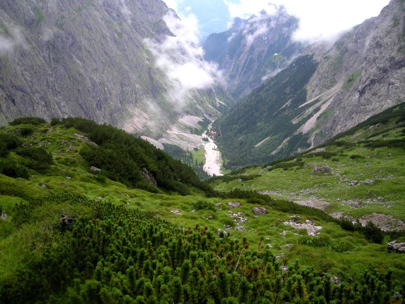Durch die starken Regenfälle der letzten Tage führt der Gebirgsbach enorm viel Wasser. Gewaltige Felsblöcke versperren den schäumenden und zu Tal stürzenden Wassermassen überall den Weg. Viele Felsenriegel quer zum Bachlauf verursachen immer wieder kleine Wasserfälle, über die der Hammersbach tosend in tiefe Gumpen stürzt, um sich von dort aus den Weg durch die enge Schlucht zu erschließen. Von den lotrecht aufragenden Felswänden rechts und links des Gewässers stürzen an unzähligen Stellen kleine Nebenbäche in die Klamm hinein. Die Watzmänner werden also von allen Seiten ordentlich geduscht. Trotzdem genießen wir dieses herrliche Naturschauspiel. Ziemlich durchnässt treten wir schließlich aus der Klamm heraus und überschreiten den Hammersbach in seinem Oberlauf auf einem schmalen Steg. In der Folge windet sich die Route als schmaler Bergpfad in die steil abfallende Flanke der Waxensteine hinein und führt in Serpentinen zum Höllentalanger und zur bewirtschafteten Berghütte hinauf. Hier auf 1.381 m über NN wird zur ausgiebigen Frühstücksrast eingekehrt.