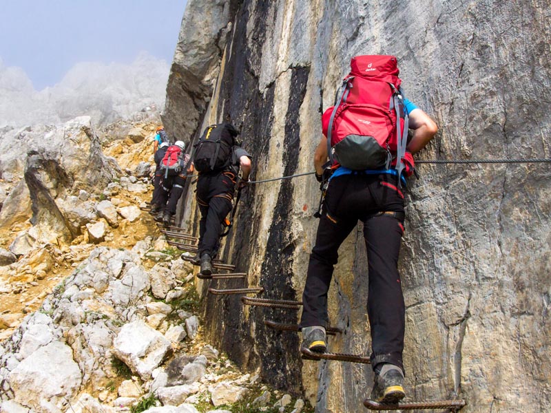 In den darauffolgenden Tagen des Bergwanderjahres 2015 im Kaisergebirge schlägt das Wetter so manche Kapriole und macht den Watzmännern das Leben schwer. Am zweiten Bergtag ist die Durchsteigung des Kufsteiner Klettersteiges geplant, ein schwieriger Eisenweg der Kategorie „D“. Trotz des sonnigen Wetters muss die Gruppe das Unternehmen mitten im Klettersteig abbrechen. Dunkle Wolken ziehen über dem Kaisergebirge auf und der weitere Anstieg erscheint zu gefahrvoll.